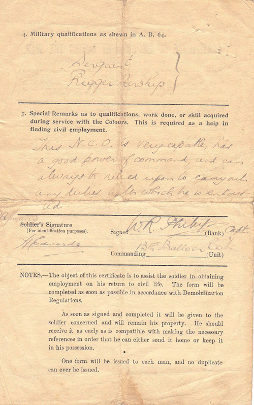 My father told me that his friend agreed to take him up on a mission in one of the new aeroplanes the base had just acquired, on the appointed night father was told to take his balloon up so wasn’t able to accompany his friend; father got back to base that night, his friend didn’t. Another family story is that he saw the last cavalry charge the British Army ever made, I don’t know if this is true or not.