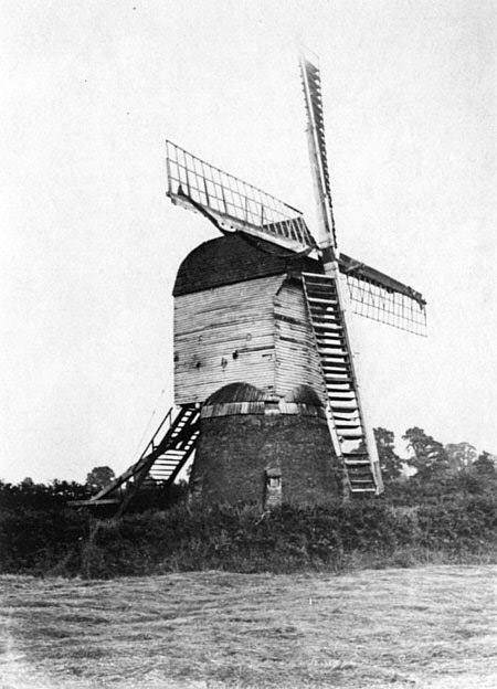 The photograph in Nigel Moon’s book was taken around 1900–5 and shows the mill apparently in working order since there is still canvas on the common sails. However, the mill has a roundhouse and an undated photograph of Hoton mill published in the Loughborough Monitor in January 1950 shows a mill with the wooden trestle exposed.