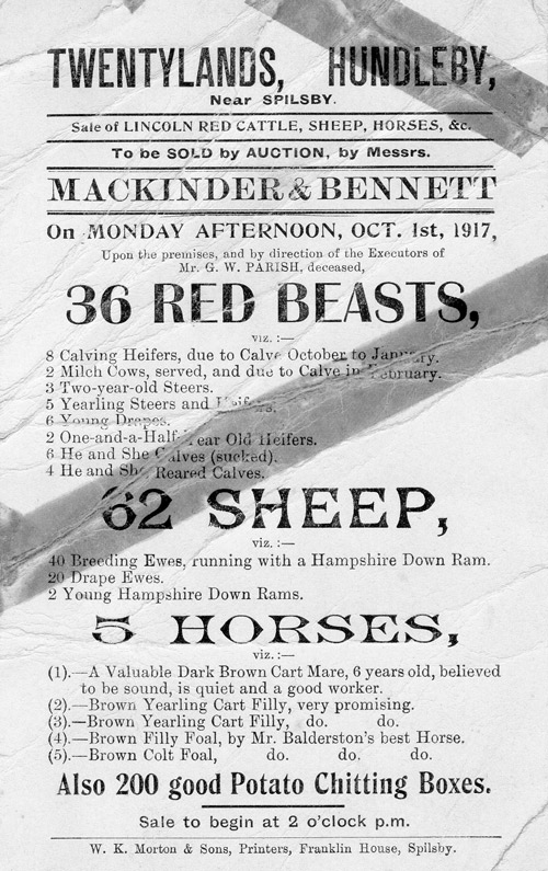 George William Parish was a farmer and, as such, he was in a reserved occupation. In April 1917 he suffered a burst appendix and because medical help was not readily available, he died of peritonitis leaving a widow, aged 35 expecting their third child, a 5 year old son and a 2 ½ year old daughter.